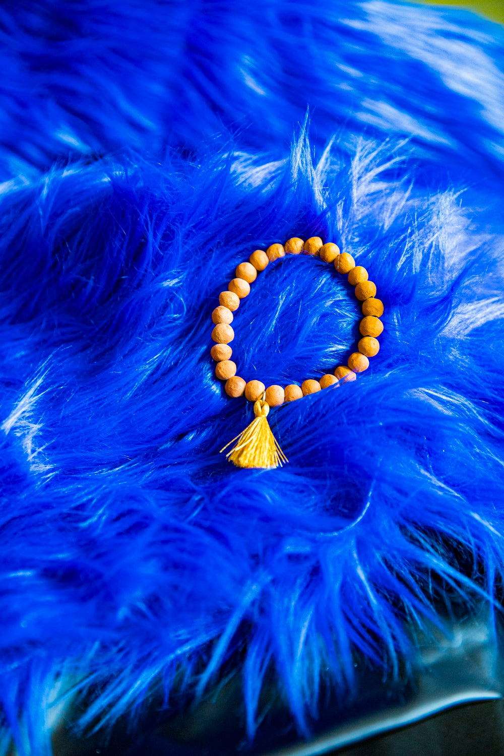 Hand formed terra cotta beads with a playful tassel on elastic cord