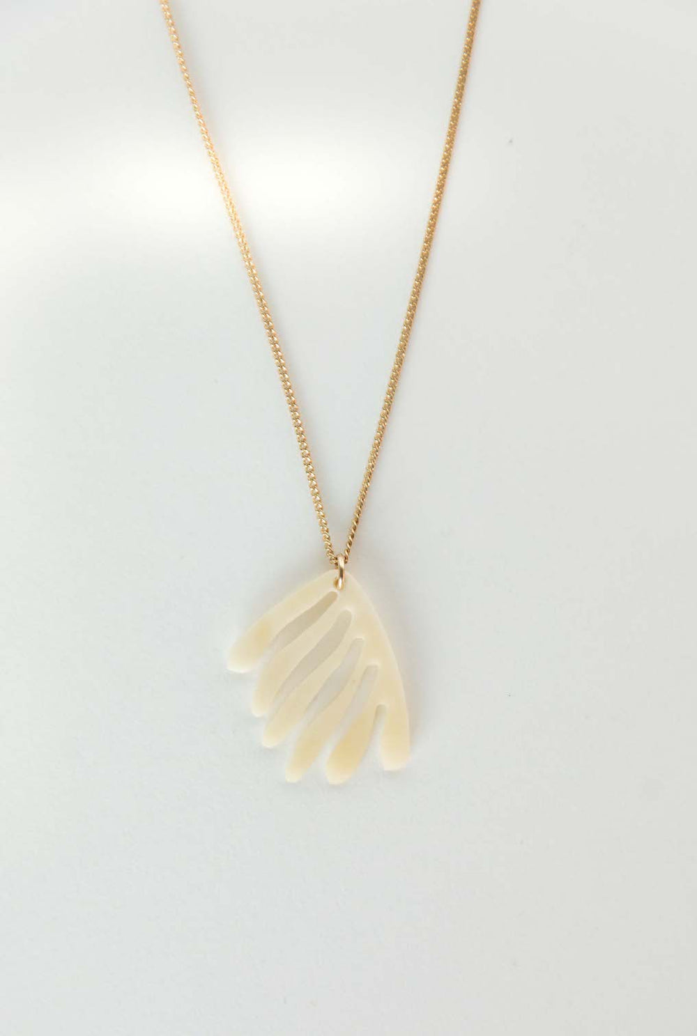 Ethically gathered cow bone up-cycled and molded by hand. On gold finished brass chain.